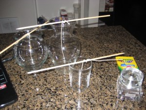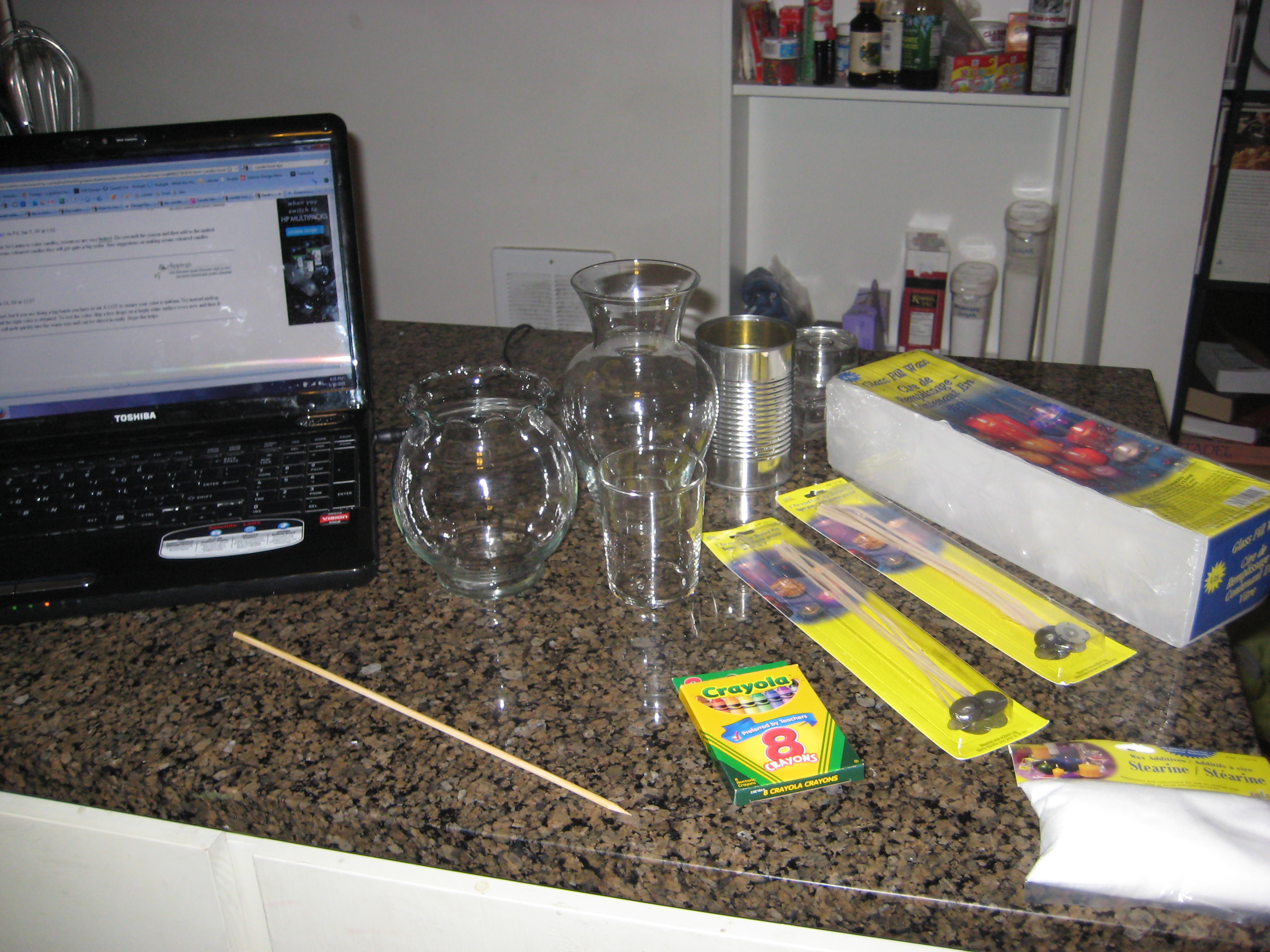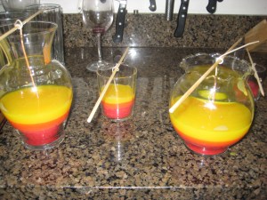 Directions: Prep your glasses with wicks twisted around skewers to keep them centered.