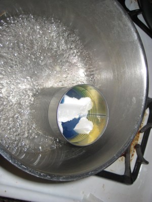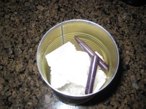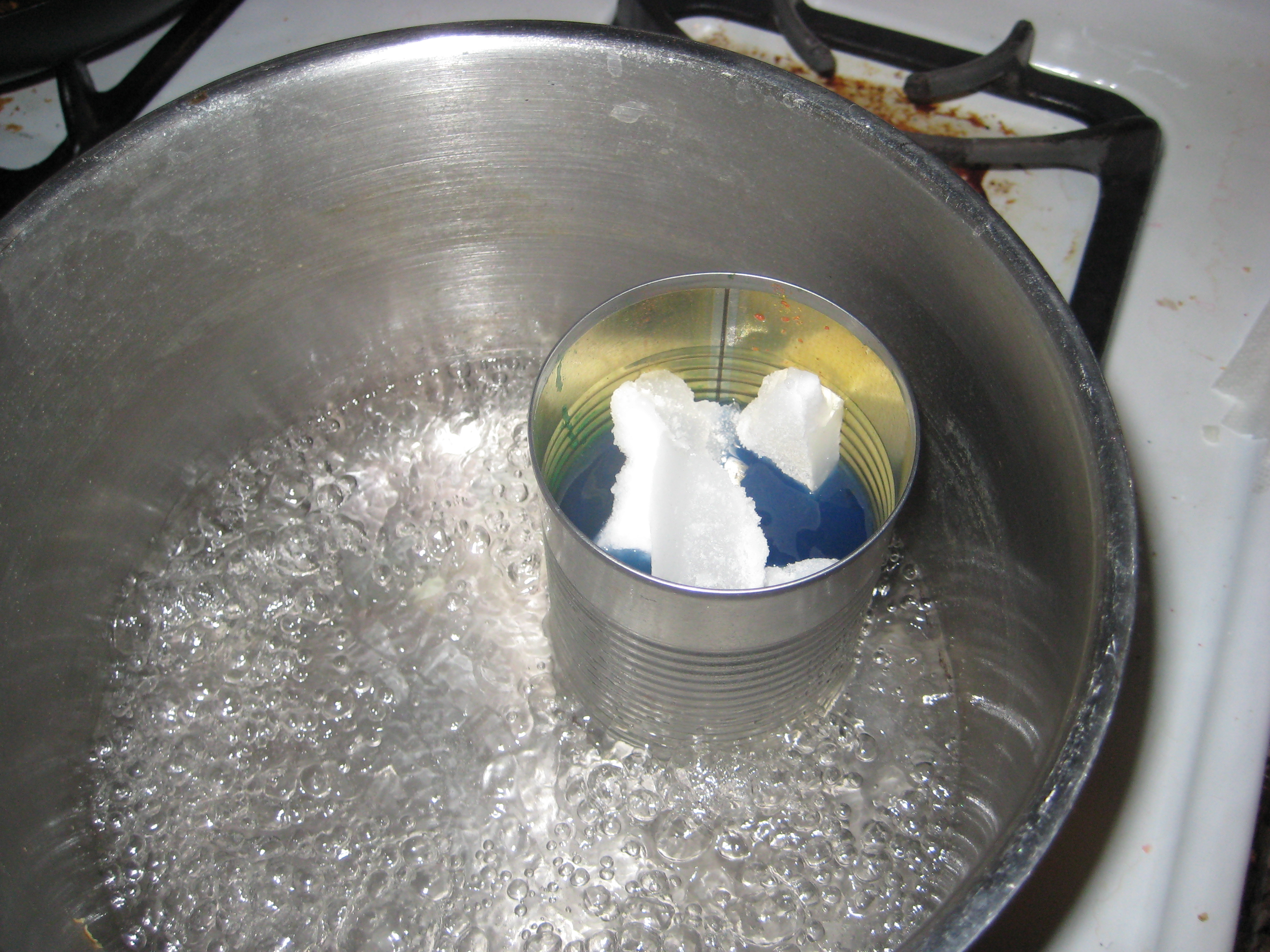 To make these rainbow candles I just needed wax and wicks from a craft shop, assorted glasses (this is a great way to reuse flower vases), skewers for stirring/wick-holding, 8-pack of Crayola crayons, empty metal can, and favorite fragrance (Gucci #2). Optional: packet of stearine powder to slow the burn and make the colors more true. I got the powder because, hey, might as well make the candles I’m spending all this time on good. Indispensible: Laptop for recipes and for tunes to melt wax by.